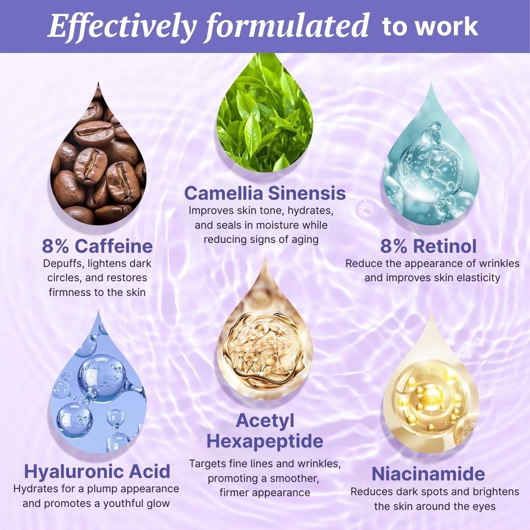 This powerful under-eye serum combines 8% caffeine, 8% retinol, hyaluronic acid, niacinamide, and peptides to visibly reduce puffiness, dark circles, fine lines, and wrinkles.